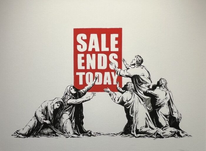 Bakgrunnur listaverksins er stef krossfestingarinnar. Í stað krossins er stórt skilti sem á stendur Útsölunni lýkur í dag (e. Sale ends today). Biblíupersónur lyfta höndum upp svo sem verið sé ...